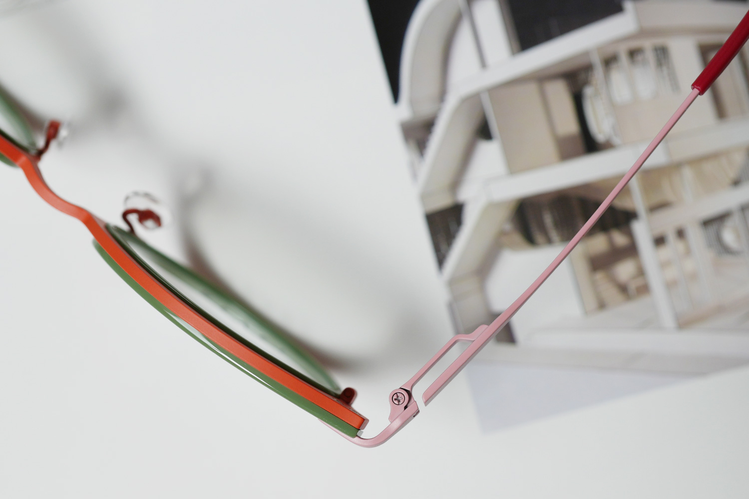 フロントはオレンジ、アセテートリングはグリーン、テンプルはピンク、モダンはレッドと全てのパーツのカラーが異なる個性的で楽しい配色。