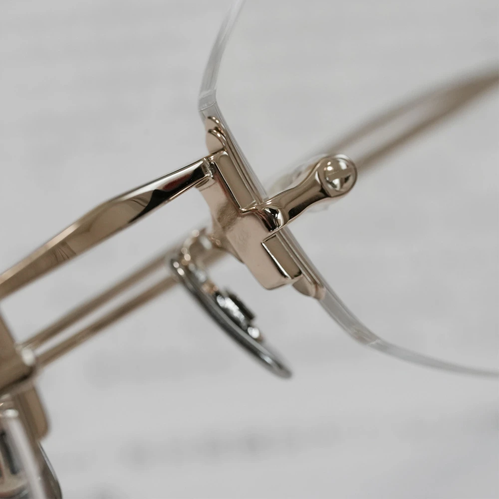 ブリッジ、テンプルなどのメタルパーツのディテールは最高峰のドレスウォッチのケース、ダイアルなどからフォルムをサンプリング。エッジの立った意匠を再現するために研磨の時間などを細かく計算して作製されています。