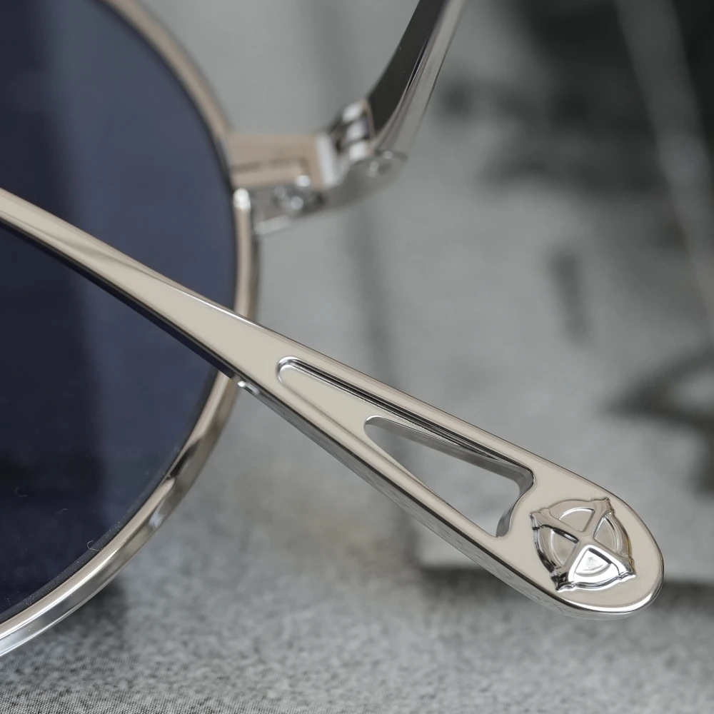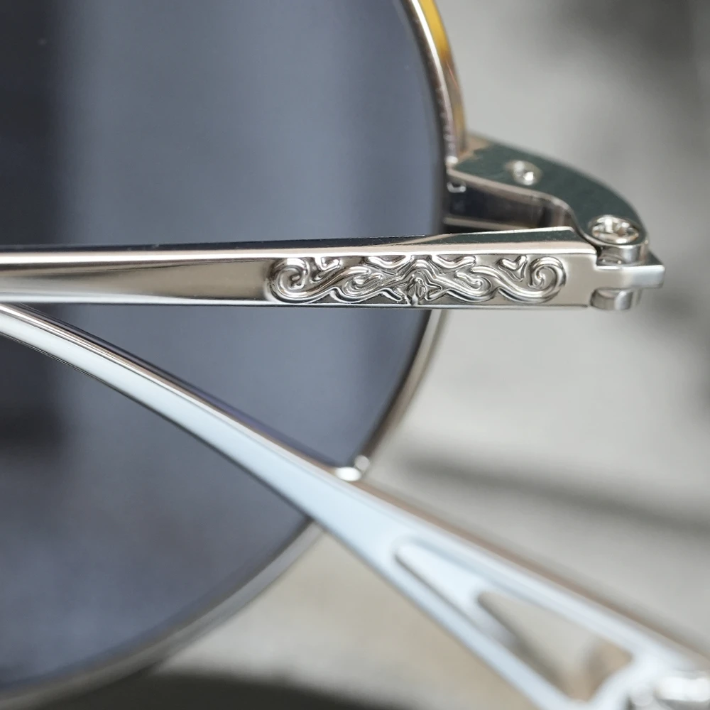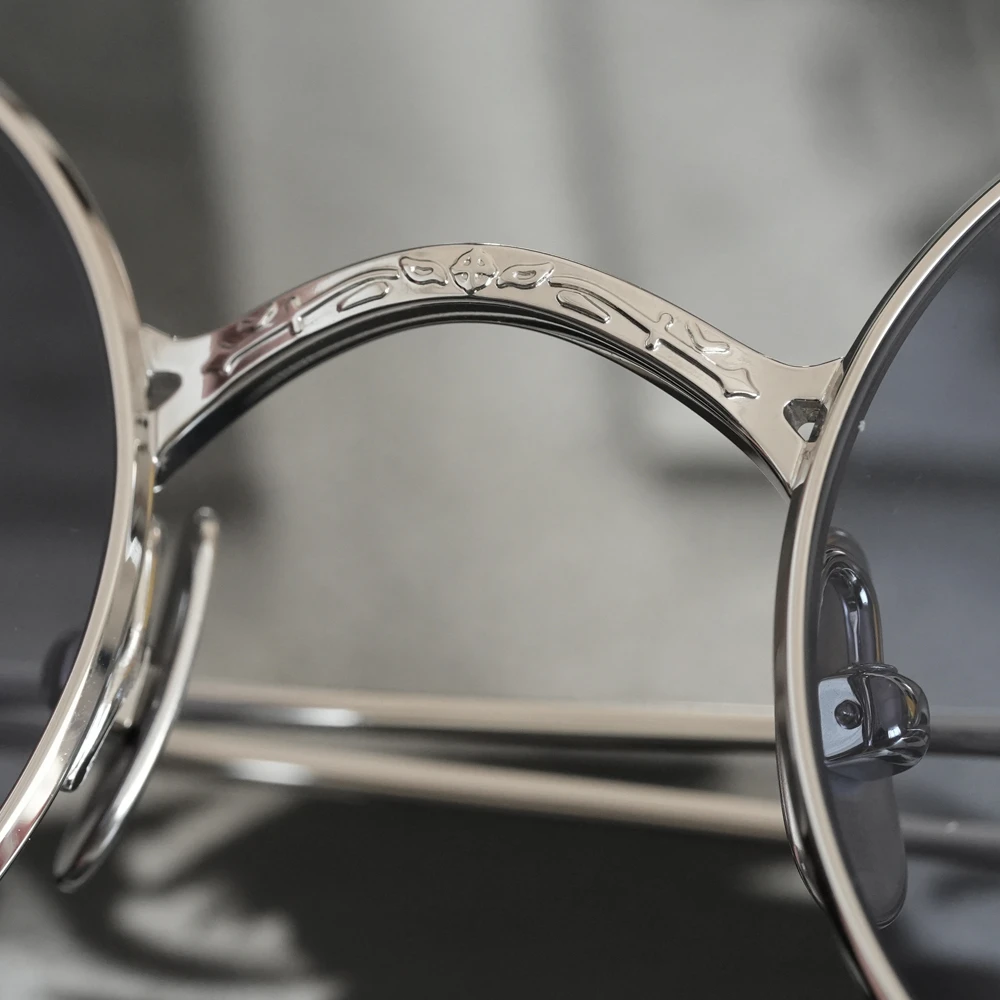 フレームはチタン素材を使用した日本製で非常に軽量、ブリッジ、ヨロイ、テンプル部分にはオリジナルの刻印が施されています。