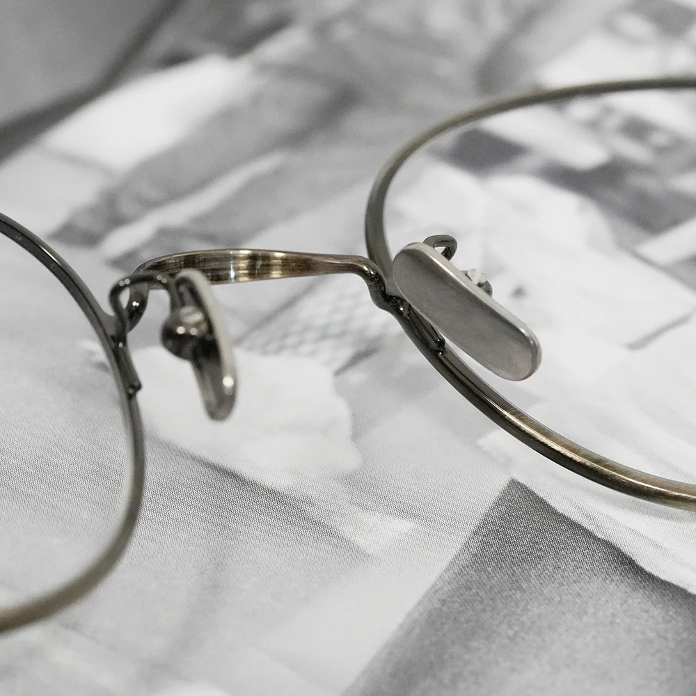 「M5」の一番の特徴はアンティークフレームを忠実に再現したダルマ型ヒンジ、柔らかい合金素材ならではのディテール。グラデーション感のあるニュアンスのあるアンティークカラーも素敵です。